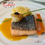 The seafood choice for main course is Pan Seared Salmon with Grilled Scallop, Topped with Lumpfish Caviar and Orange Beurre Blanc Sauce