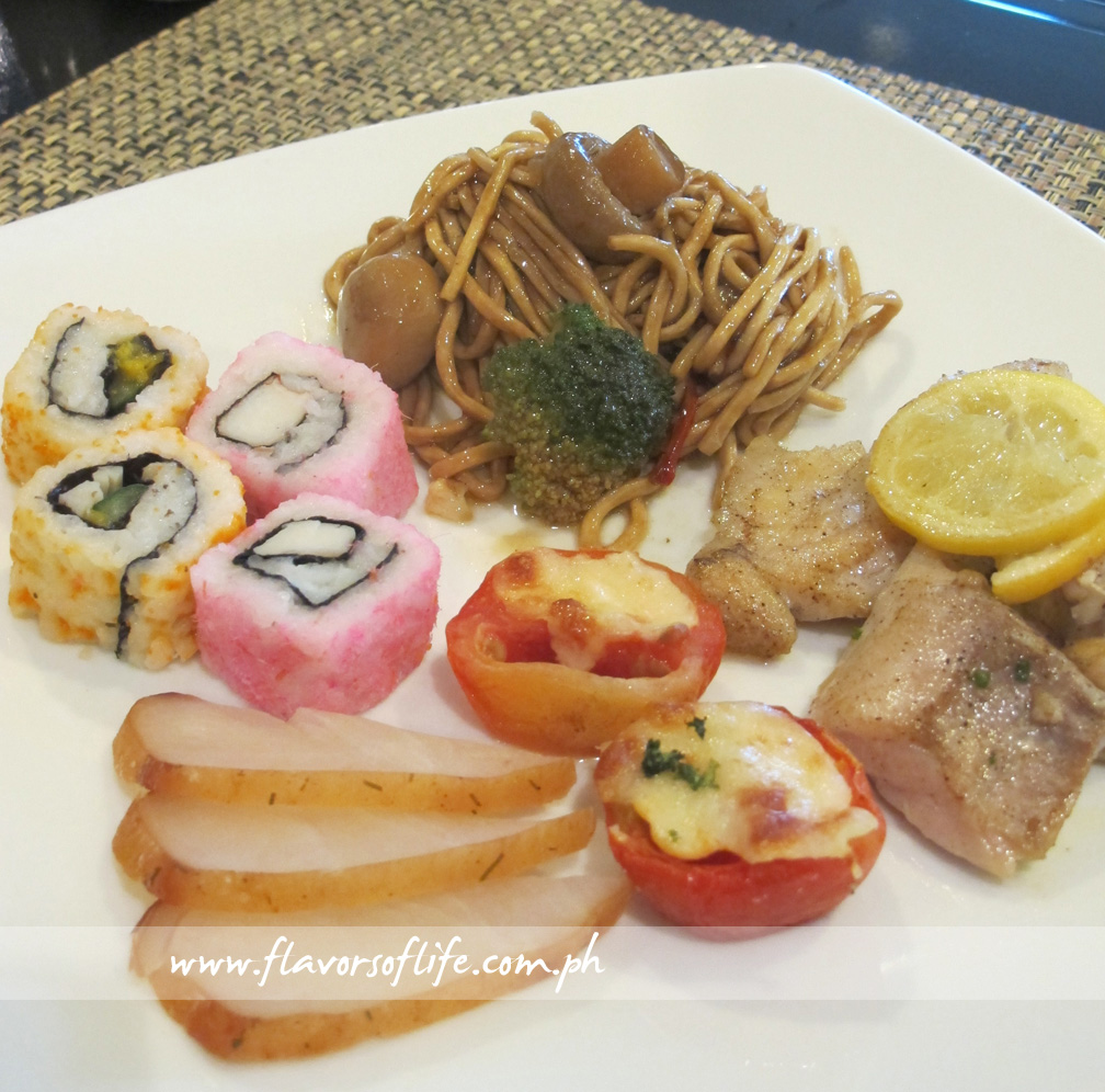 My breakfast platter of smoked tanigue, California maki, stir-fried noodles with vegetables, fish fillet with lemon butter, and baked tomatoes with cheese