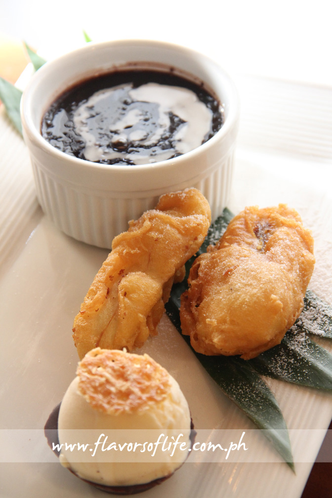 Dessert platter of Coconut Ice Cream in Chocolate Cup, Pisang and Pulut Hitam