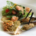 Platter of New Zealand delights, clockwise from top: Mesclun Greens with Mango, Apple and Garlic Fried Prawns in Raspberry Dressing; New Zealand Mussels with Crunchy Crumb Topping; and Horseradish and New Zealand Smoked Salmon Crusted Snapper Fillet in Tomato Beurre Blanc