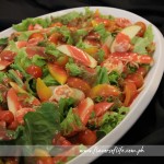 Mesclun Greens with mango, Apple and Garlic Fried Prawns in Raspberry Dressing