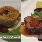 Braised Lamb Shank Pie with Minted Mushy Peas (left), and Paper Bark-Smoked Tajima Wagyu Beef, Busy Tomato Fondue, Macadamia Dust, Honey-Truffle Glazed Beets and Sweet Potato (right)