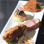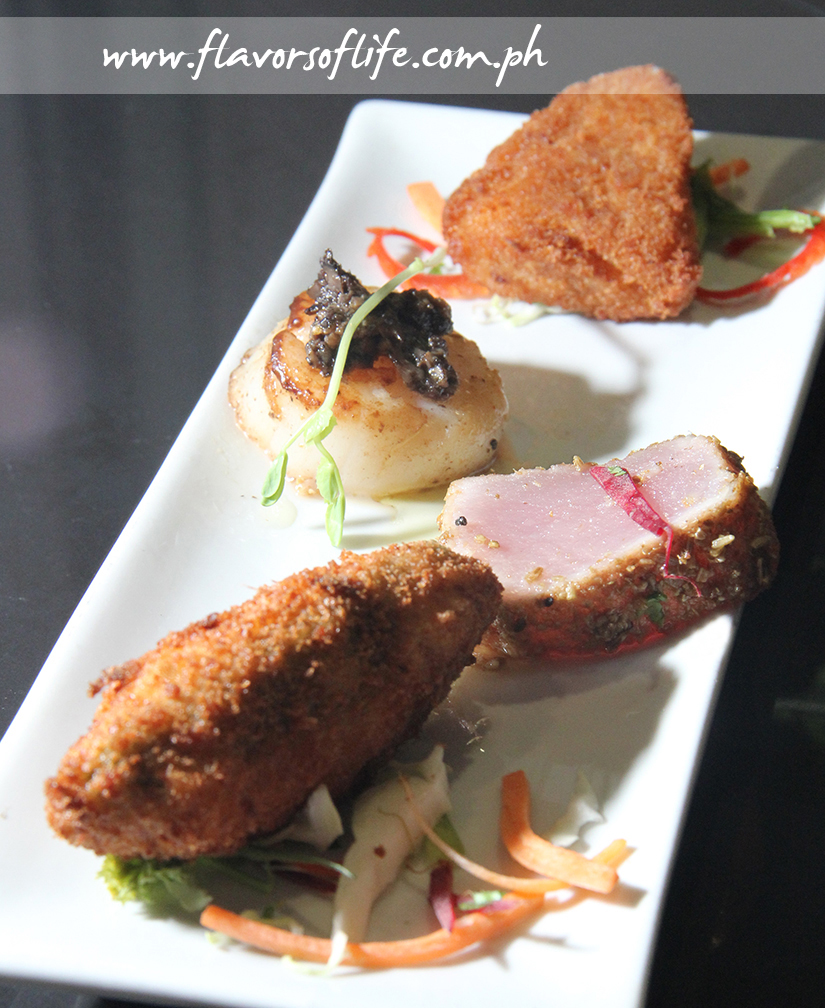 Appetizers galore, from top: Four-cheese Croquetas / Scallop with Foie Gras and Mushroom / Seared Tuna / Jalapeno Pop