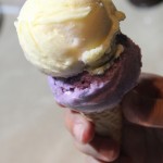 Queso and Ube Sorbetes from the ‘dirty ice cream’ cart, served on a sugar cone