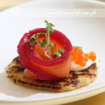 01-amuse bouche of marinated salmon with beetroot puree, potato blini n salmon roe-IMG_1226