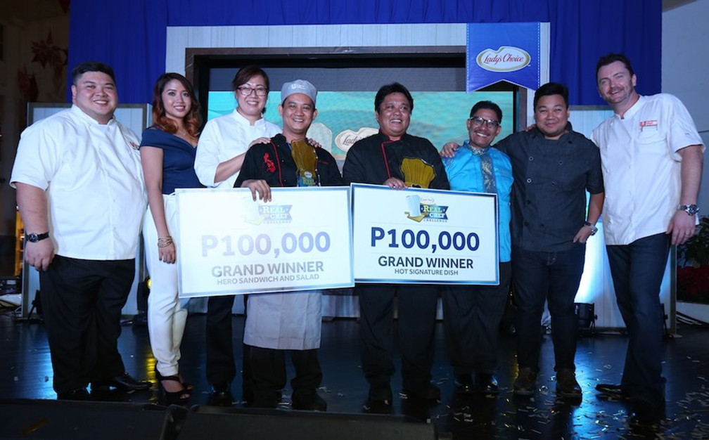 Lady’s Choice Real Chef Challenge grand winners Chef Demerlito Tulaylay and Chef Bong Ronquillo receive their symbolic prizes, from left: Chef Brando Santos,