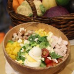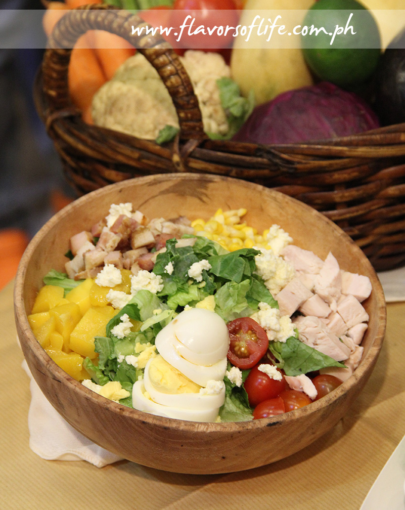 Green Pastures’ Farmhouse Salad consists of shredded kale, chopped Romaine, roasted chicken, mambo goat cheese, hard-boiled eggs, bacon, corn, ripe mangoes, grapes and tomatoes