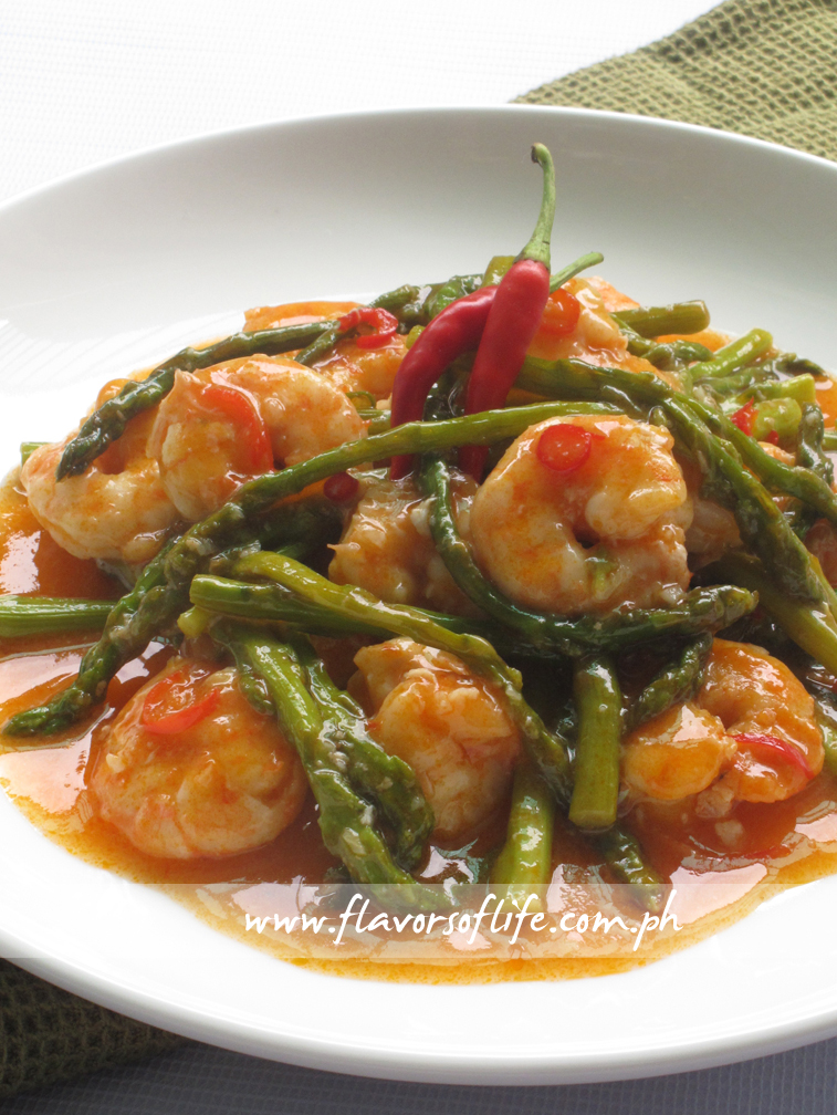 Finally, the rains stopped, and we were able to drive home on relatively dry roads on Friday night. There was so much to do at home after being away – against my will – for four days. Thank God the floods didn’t get inside the house, as they did during Typhoon Ondoy back in 2009, but there was still so much to do, and one of the things that I had to attend to was rummaging through the ref and freezer. During the whole time that we were away, I kept in touch with our neighbor to find out what was happening at homebase. I tell you, it was such a relief to know the floods along our street were only gutter-deep, in contrast to the deep floods that rendered the main road unpassable for days. I’ve been told our electrical supply was cut from Tuesday night to Thursday night, and so I knew the ref, especially the freezer, needed my immediate and undivided attention. So, I rummaged through the freezer, threw away what needed to be thrown away after two days of being ‘un-frozen,’ and salvaged what could be salvaged. I was so thankful that the relatively big shrimps that I had bought just the Saturday prior to the Great Monsoon Flood were still OK, but I didn’t want to keep them too long in the freezer afterwards, so I bought some asparagus and cooked them into Chili Shrimps and Asparagus.