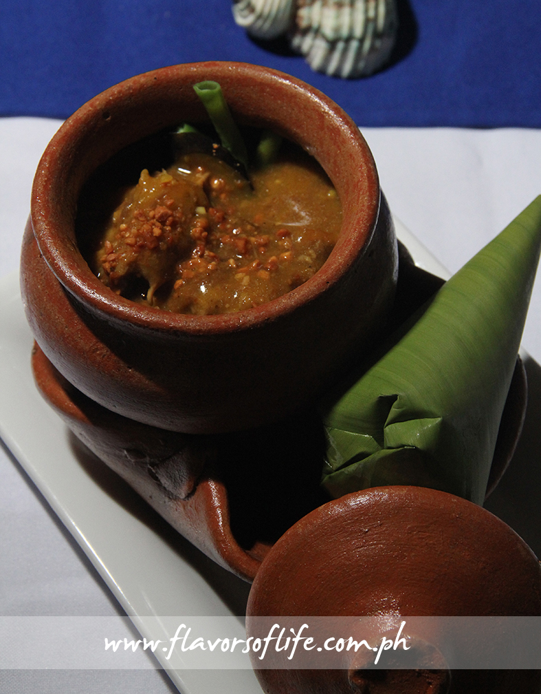 SIXTH COURSE: BINAGOONGANG BABOY-DAMO AT KARE-KARE. It’s simply Wild Boar with Fermented Shrimps and Vegetables in Peanut Sauce, but the dish is actually a bit complex. The Kare-Kare, served in a small clay pot, is prepared the Malaysian rendang way; while the rice is wrapped and cooked in a banana leaf cone with bagoong, whose Malaysian version is called belachan, strips of wild boar and fish sauce using Malaysian ketupat cooking technique.