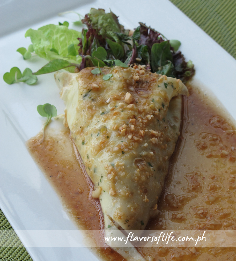 Chef Jessie served her signature Ciabatta bread with Special Dip on the table. I have always loved her bread and dip, so I enjoyed quite a few slices. Then came Smoked Salmon Caviar Pie (layers of grated egg white, cream cheese, smoked salmon and caviar with shallots) for me and Ubod Salad for Raff, with Dragon Maki for sharing.
