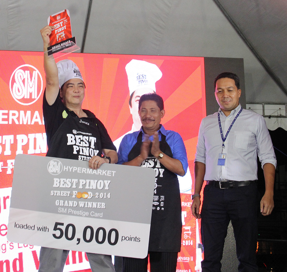 SM Hypermarket’s The Best Pinoy Street Food 2014 grand champion Jose Nestor Guevara II receiving his prizes from celebrity chef Boy Logro and SM Hypermarket store manager Angelo NazarenoAFTER going through several grueling cook-offs, lugaw and barbecue stall owner Jose Nestor ‘Jones’ S. Guevara II of Las Piñas emerged as the grand champion of SM Hypermarket’s Best Pinoy Street Food 2014 cooking competition.